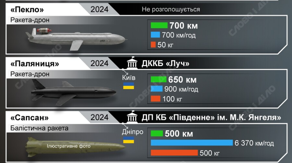 Напомним, на нашей инфографике – сравнение дальности, максимальной скорости и веса боевой части новых украинских ракет и ракет-дронов.