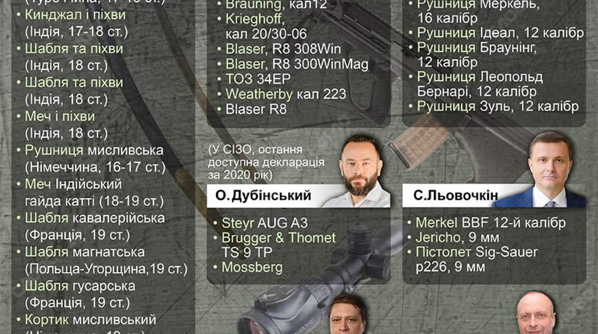 Александр Дубинский, избранный нардепом от «Слуги народа», с 2023 года находится в СИЗО. Его последняя доступная декларация относится к 2020 году. Согласно ей депутат владеет тремя единицами охотничьего огнестрельного оружия: австрийской винтовкой Steyr AUG A3, карабином Brugger & Thomet и гладкоствольным ружьем Mossberg.
