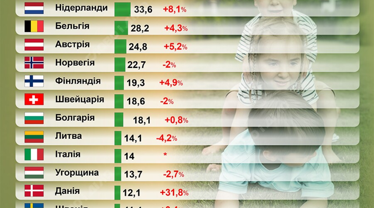 Также в первой десятке – Словакия, Ирландия, Нидерланды, Бельгия и Австрия. В этих странах от 24,8 до 41,2 тысячи украинских детей-беженцев. В Норвегии (не член ЕС) – 22,7 тысячи детей, в Финляндии – 19,3 тысячи.